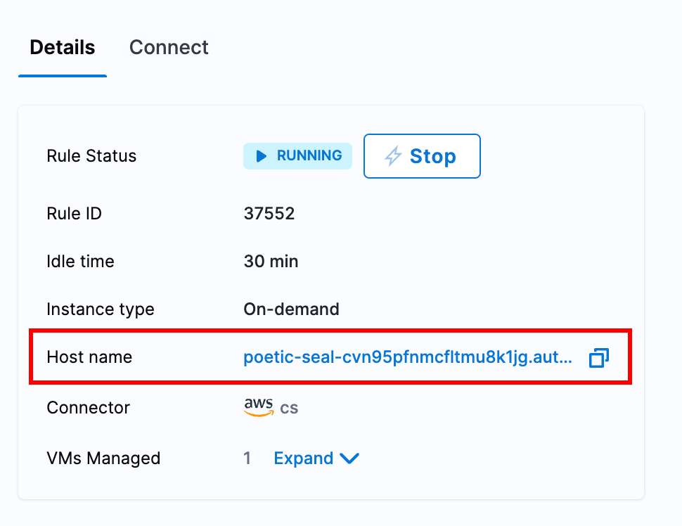• Hostname of the AutoStopping Rule: Hostname of the AutoStopping Rule for which you want to configure the ECG. You can copy the hostname from the AutoStopping dashboard. To obtain the hostname, do the following: