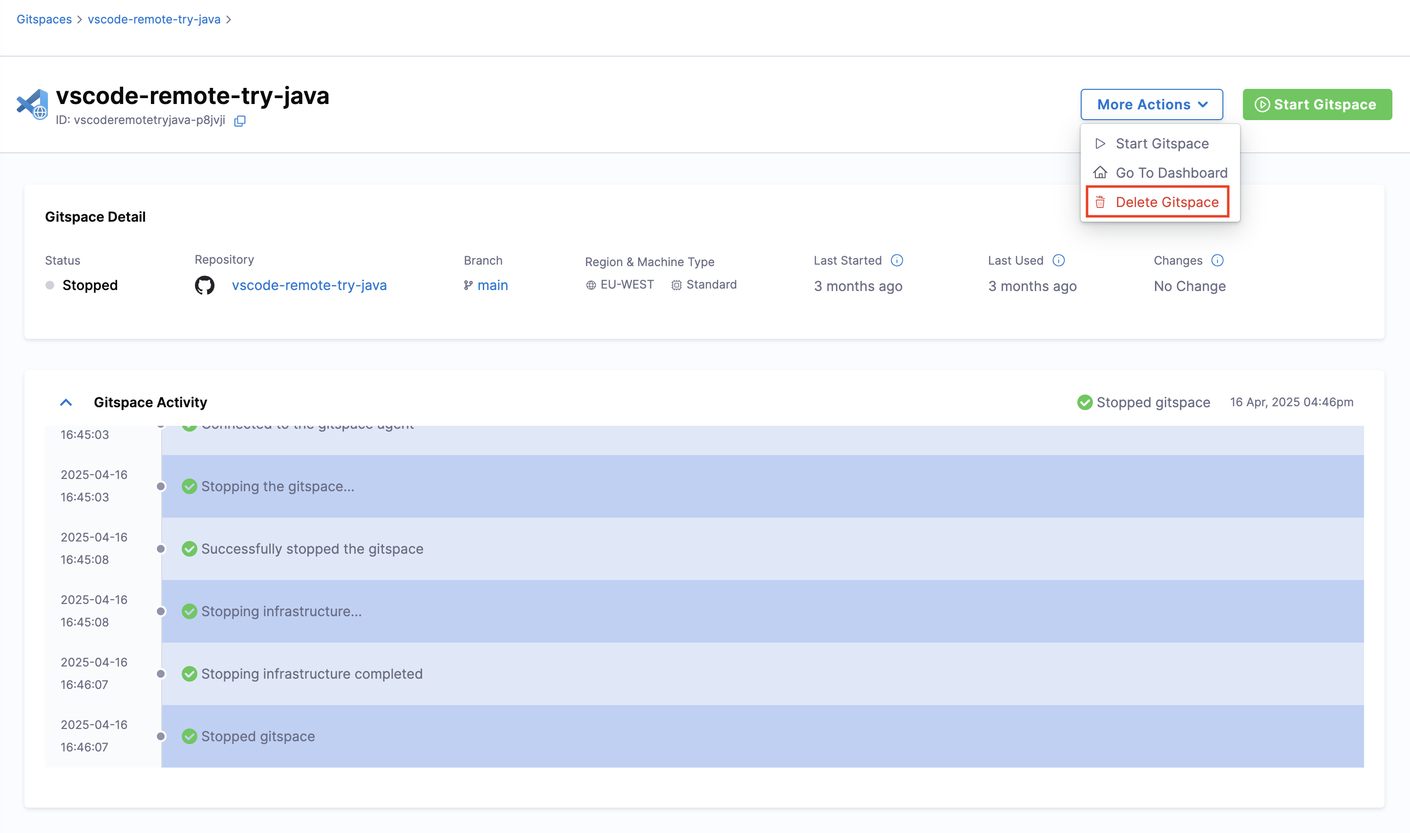 Follow the instructions below to delete an existing Gitspace: