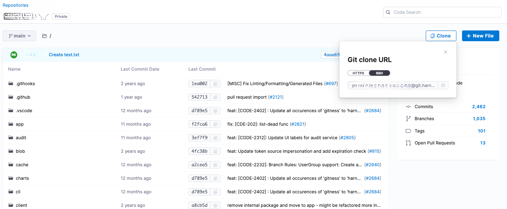 - In Harness, navigate to the repository you want to clone and copy its SSH URL.