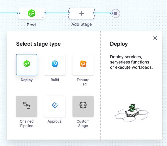 2. To add another stage to the pipeline, select the plus sign (+) or select Add Stage after the first stage, and then select Deploy.