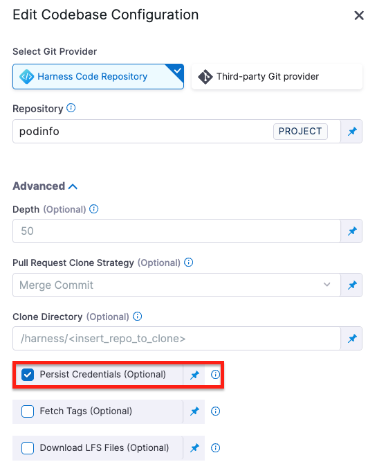 When selected, Harness persists the Git credentials used during the clone step so they remain available for subsequent steps in the same build.