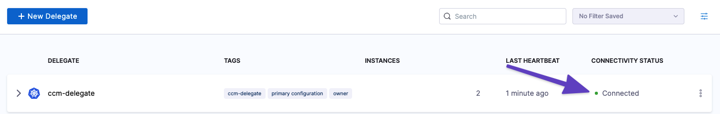 2. In the Harness UI, verify that the delegate appears in the delegates list. It might take two or three minutes for the Delegates list to update. Make sure the Connectivity Status is Connected. If the Connectivity Status is Not Connected, make sure the Docker host can connect to https://app.harness.io.