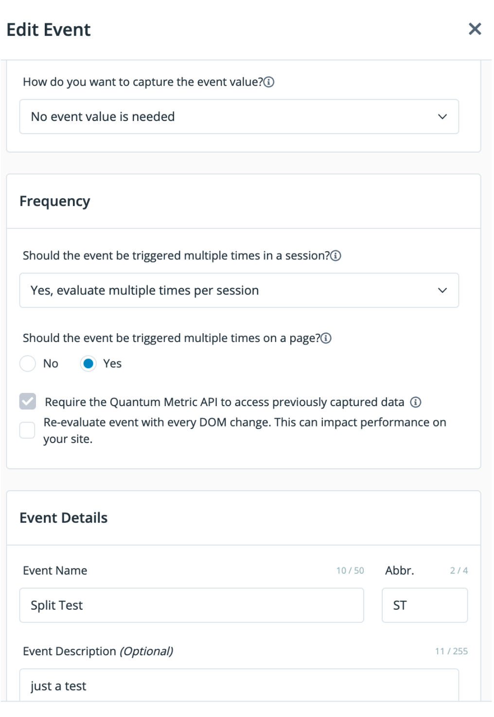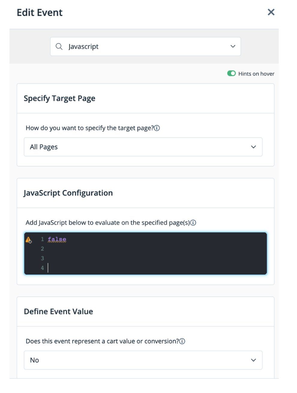 You can now create a JavaScript event in the Event settings of the Quantum Metric user interface by entering a JavaScript configuration. Do the following: