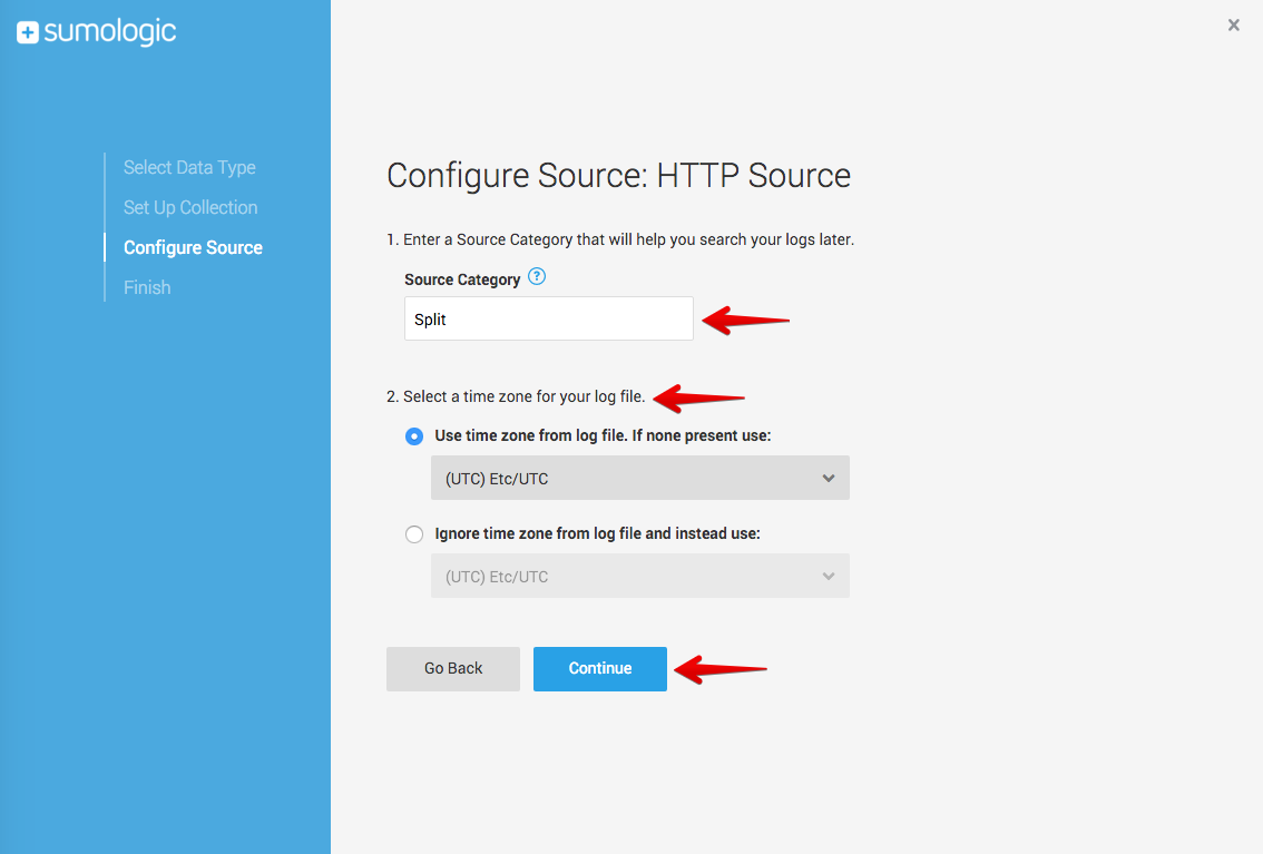 4. On the Configure Source page specify a Source Category (use Split as the name) and a Time zone, and then click Continue.