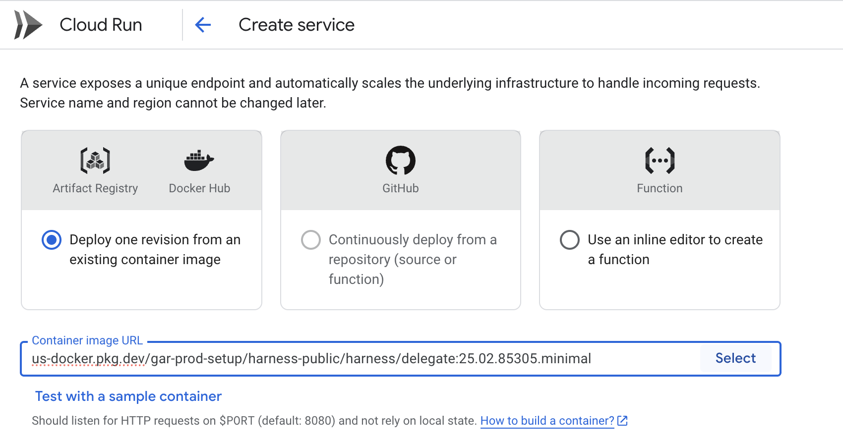 2.1. Add Container Image URL. You can select it from Artifact Registry or provide a Docker Hub Image URL.