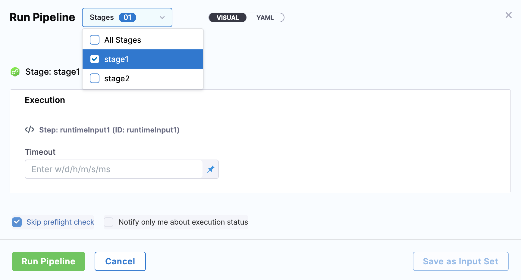 You might encounter situations where you want to run some, but not all, stages. For example, if only one stage fails, you might want to rerun only the failed stage. In Harness, you can select specific stages to run, rather than the entire pipeline.