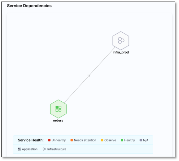 The Service Dependency section graphically displays the dependencies between applications, infrastructure, and data.