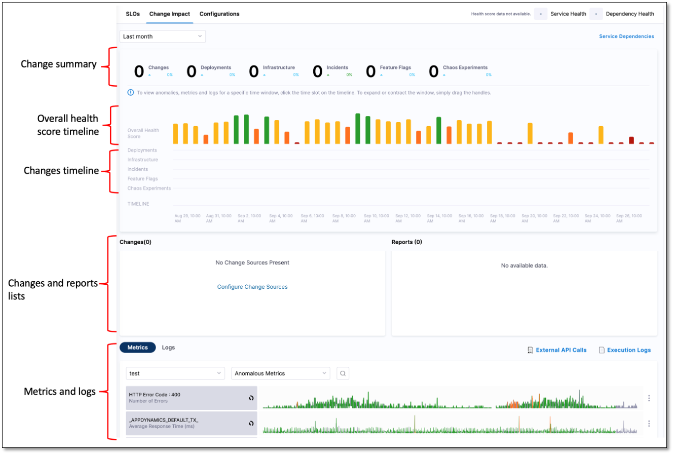 The Change Impact dashboard enables you to observe and track the health of monitored services.