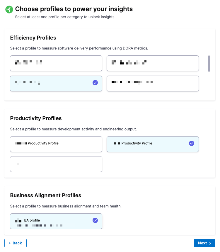 • Under Efficiency Profiles, choose the profile that you had configured previously for measuring software delivery performance metrics such as DORA.