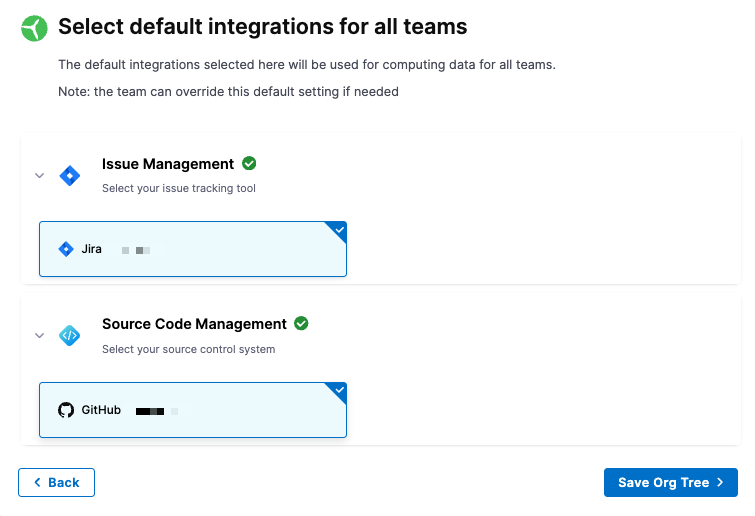 10. Configure default integrations for all teams in this Org Tree. These can be customized later at the team level: