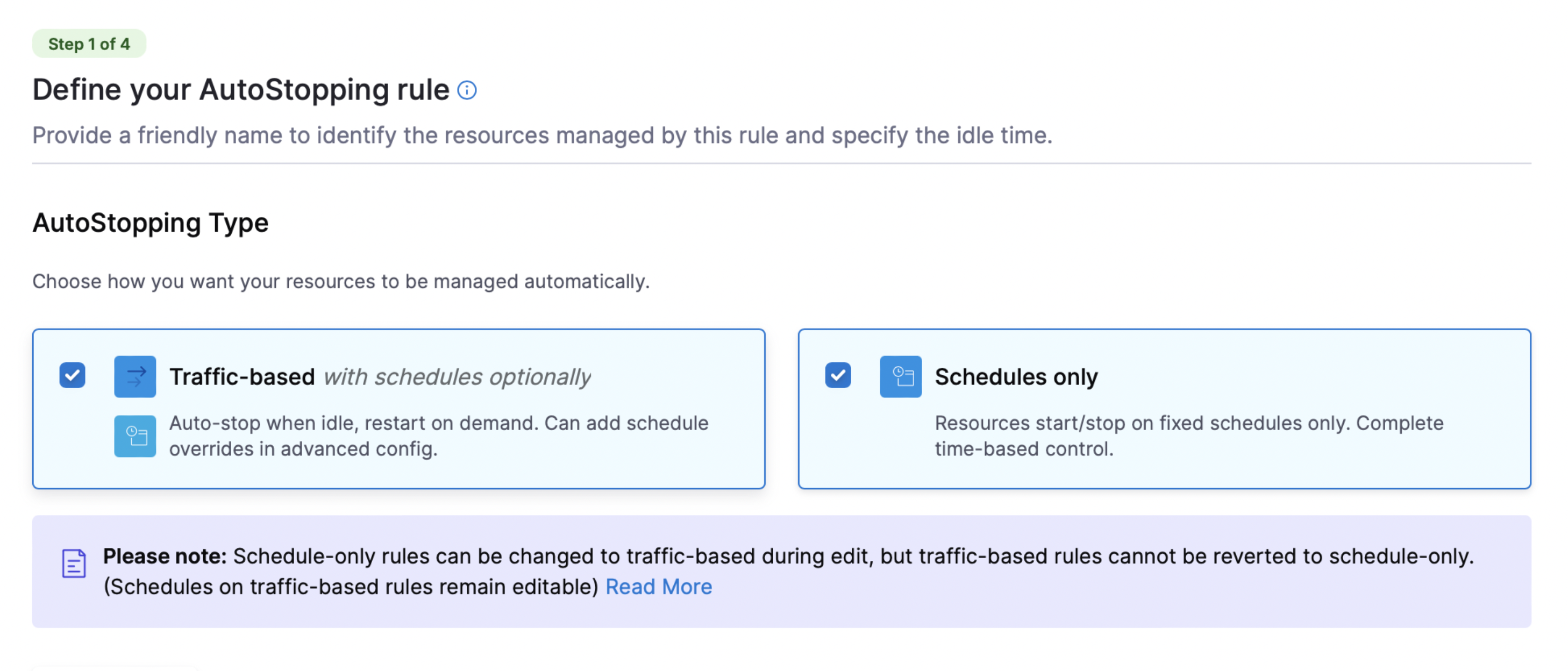 • Kubernetes AutoStopping Rules V2: Kubernetes AutoStopping rules have been upgraded to V2. The new template is now available on the K8s rule creation step:
