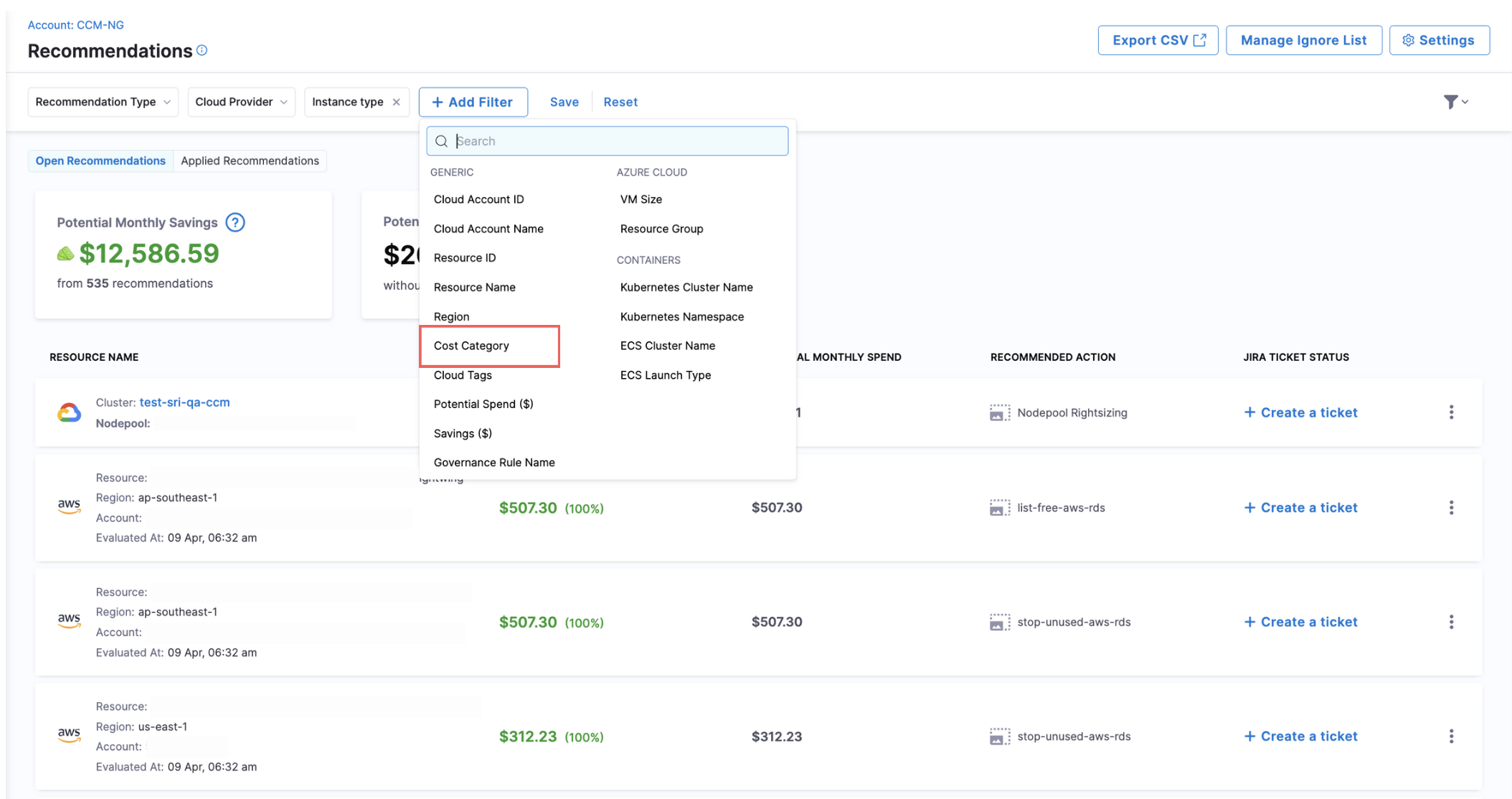 • Anomaly Filtering by Cost Buckets: Added a quick filter to view anomalies by Resource or Cost Buckets. In the Cost Buckets view, you can see which cost bucket each anomaly belongs to, drill down for details, and redirect to a Perspective with the cost bucket filter applied. You can also filter by cost categories within the Cost Buckets view. This feature is behind a feature flag. Contact Harness Support to enable it. [CCM-27460]