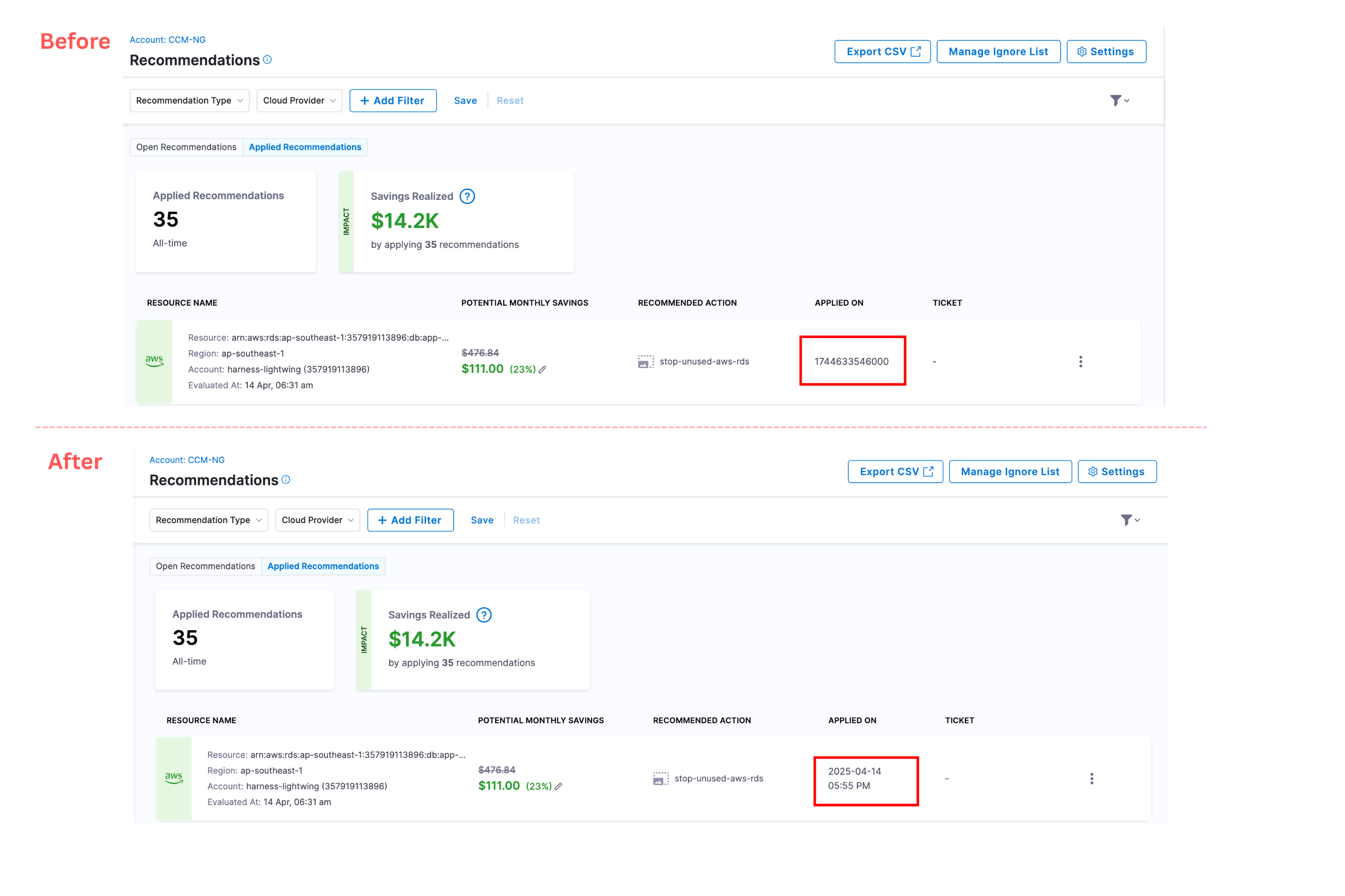 • Recommendation createdAt Field Population: Fixed an issue where the createdAt field was not populated when generating recommendations. The field is now correctly populated upon recommendation generation. [CCM-29613]
