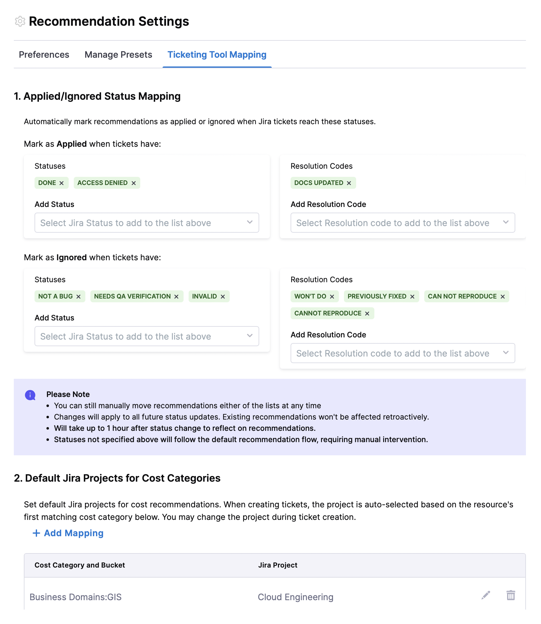 • Cost Category–JIRA Mapping Cleanup: Empty rows will no longer be added when users attempt to create multiple mappings without saving them. [CCM-29161]